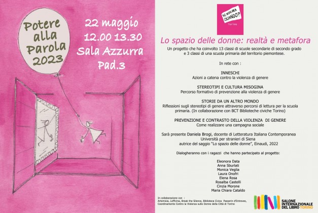 Nell’ambito del Salone Internazionale del Libro che si terrà dal 18/05/23 al 22/05/23, Senonoraquando? Torino presenta per il decimo anno consecutivo il Progetto “Potere alla Parola” che quest’anno sarà intitolato: “Lo spazio delle donne: realtà e metafora”. Sono state coinvolte 13 classi di scuole secondarie di secondo grado e 3 classi di una scuola primaria del territorio piemontese. Sarà presente Daniela Brogi, l’autrice del libro “Lo spazio delle donne”. Dialogheranno con i ragazzi che hanno partecipato al progetto: Eleonora Data, Anna Sburlati, Monica Veglia, Laura Onofri, Elena Rosa, Rosalba Castelli, Cinzia Morone, Maria Chiara Cataldo.